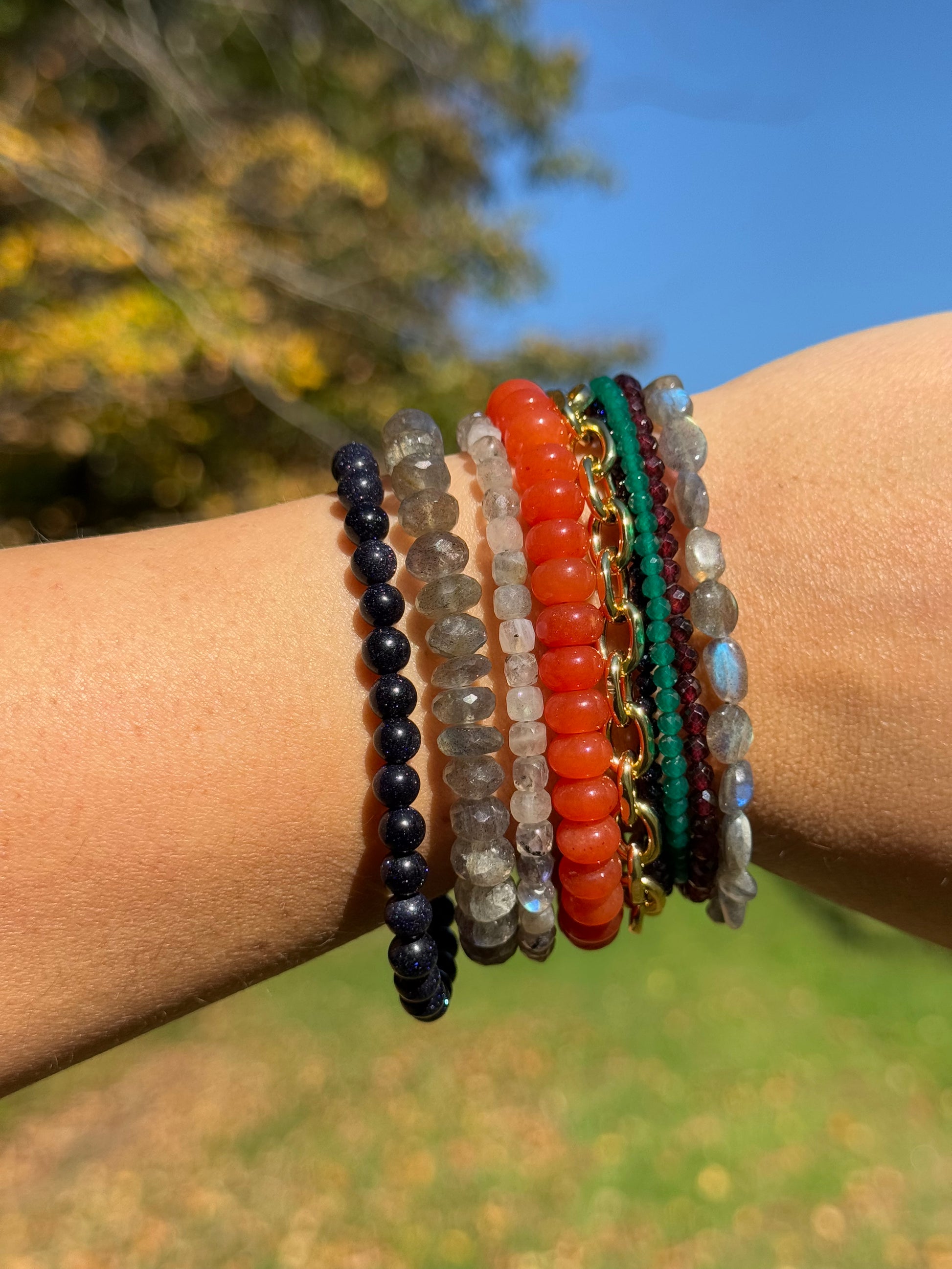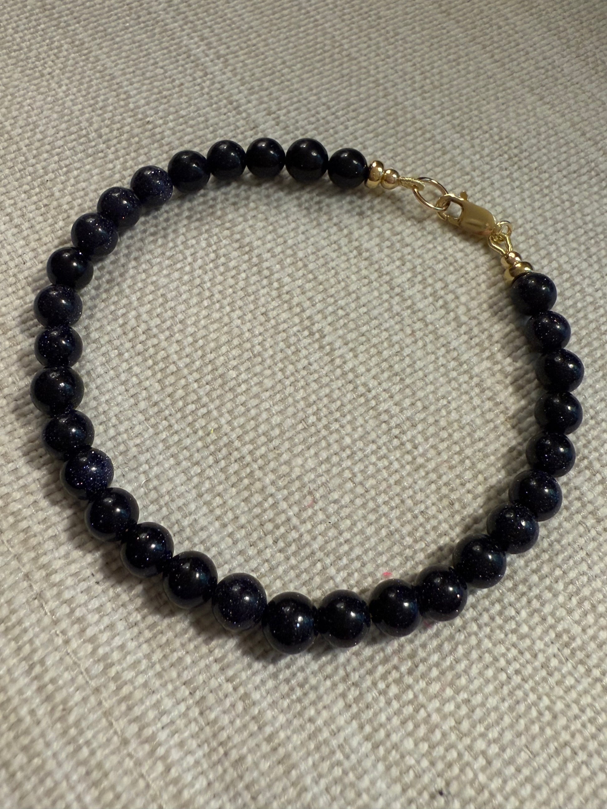 Blue goldstone 6mm beads bring the magic of the autumn night sky to life in this bracelet. Measuring 6.5", it’s crafted on gold-toned wire with gold-filled accents and finished with delicate French wire closure. Perfect for adding a twinkle to your wrist!