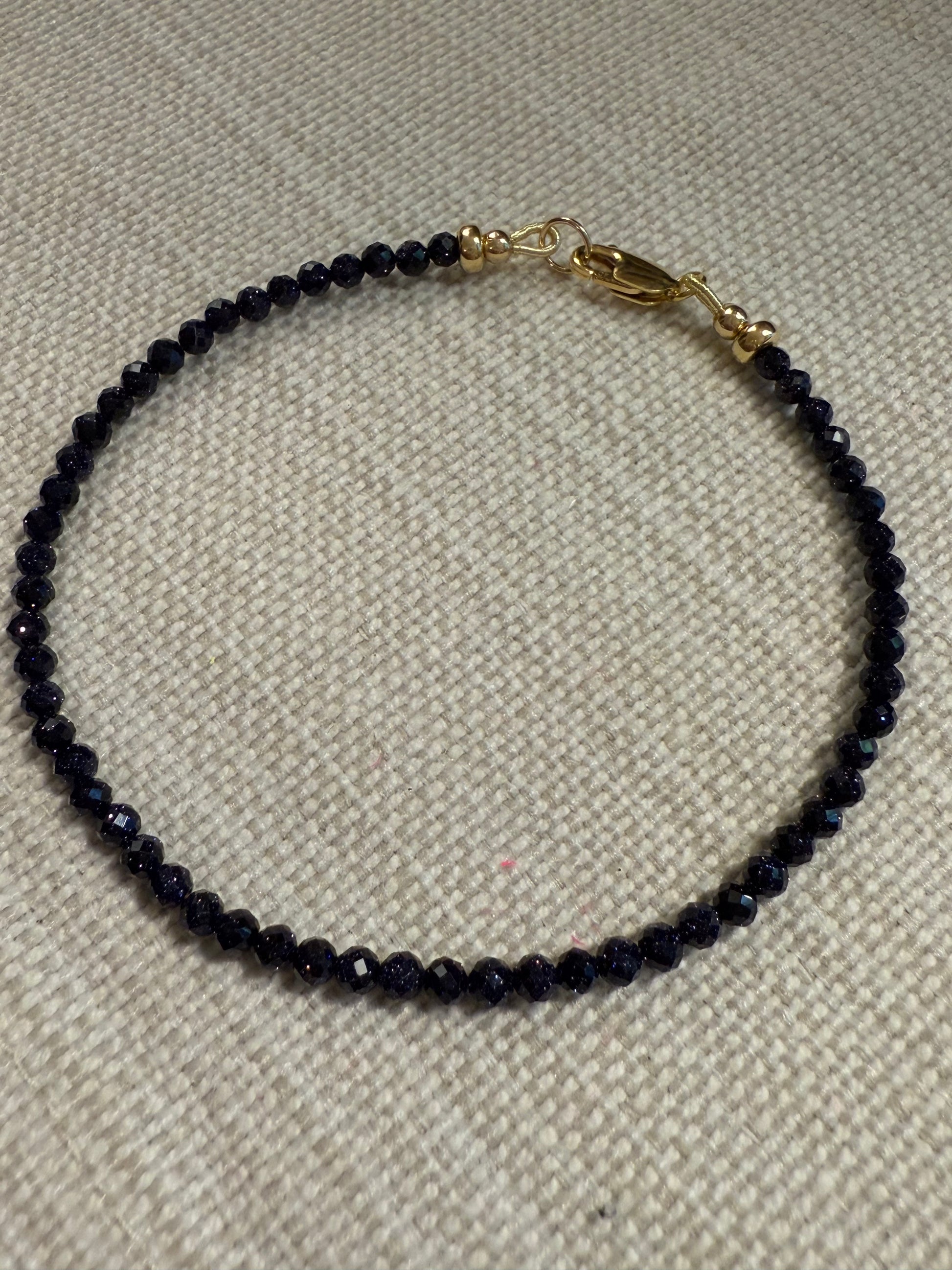 Blue goldstone 3mm faceted beads bring the magic of the autumn night sky to life in this bracelet. Measuring 6.5", it’s crafted on gold-toned wire with gold-filled accents and finished with delicate French wire closure. Perfect for adding a twinkle to your wrist!