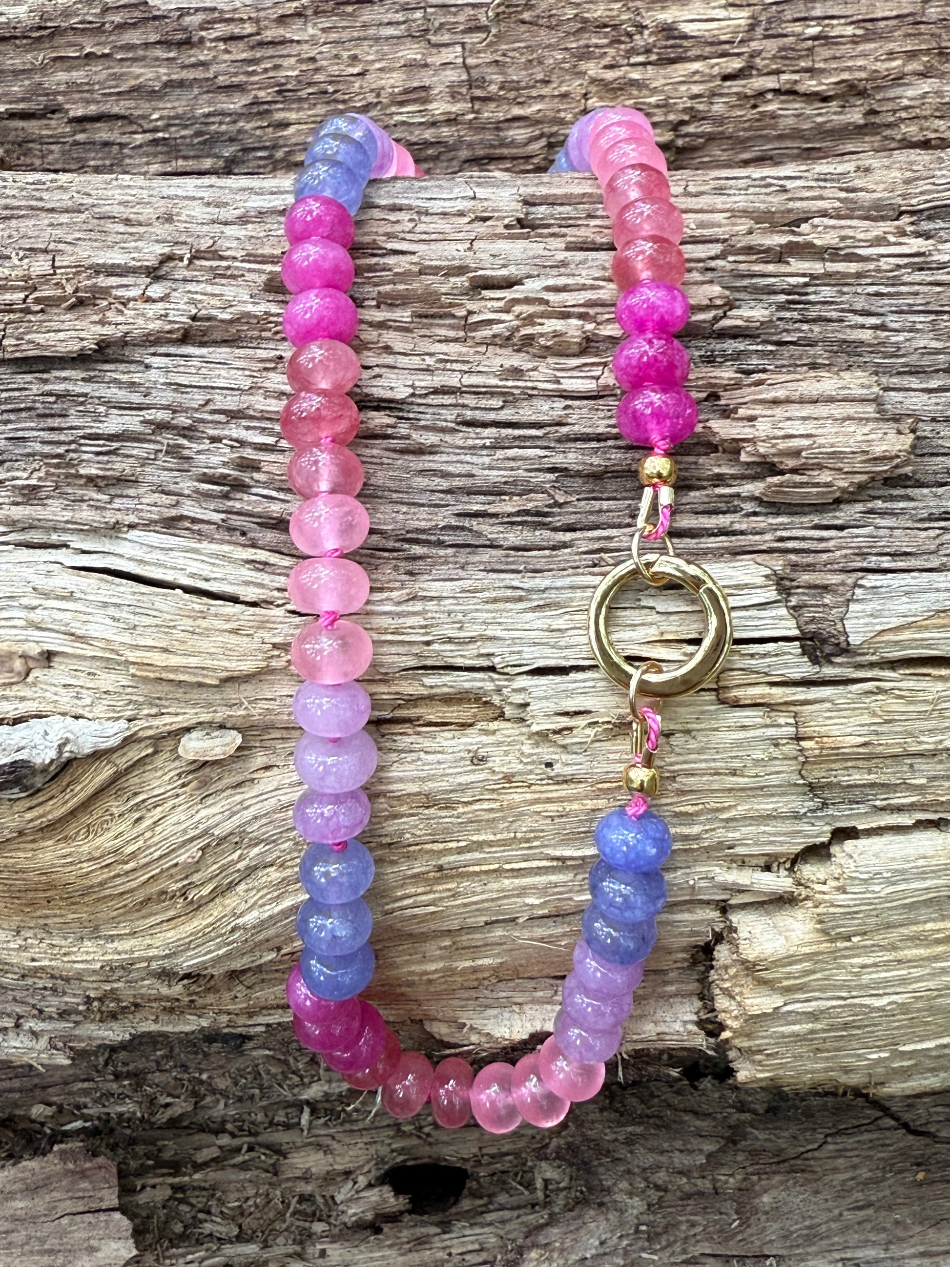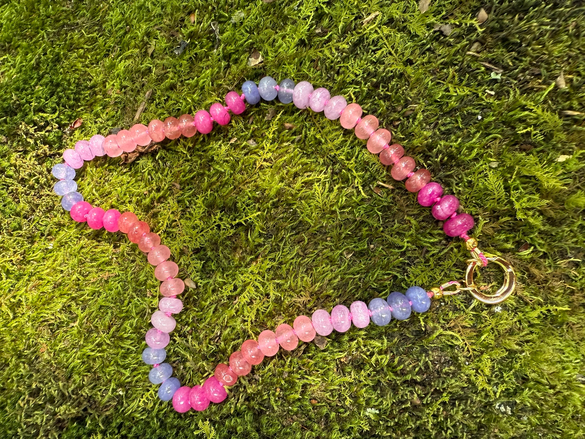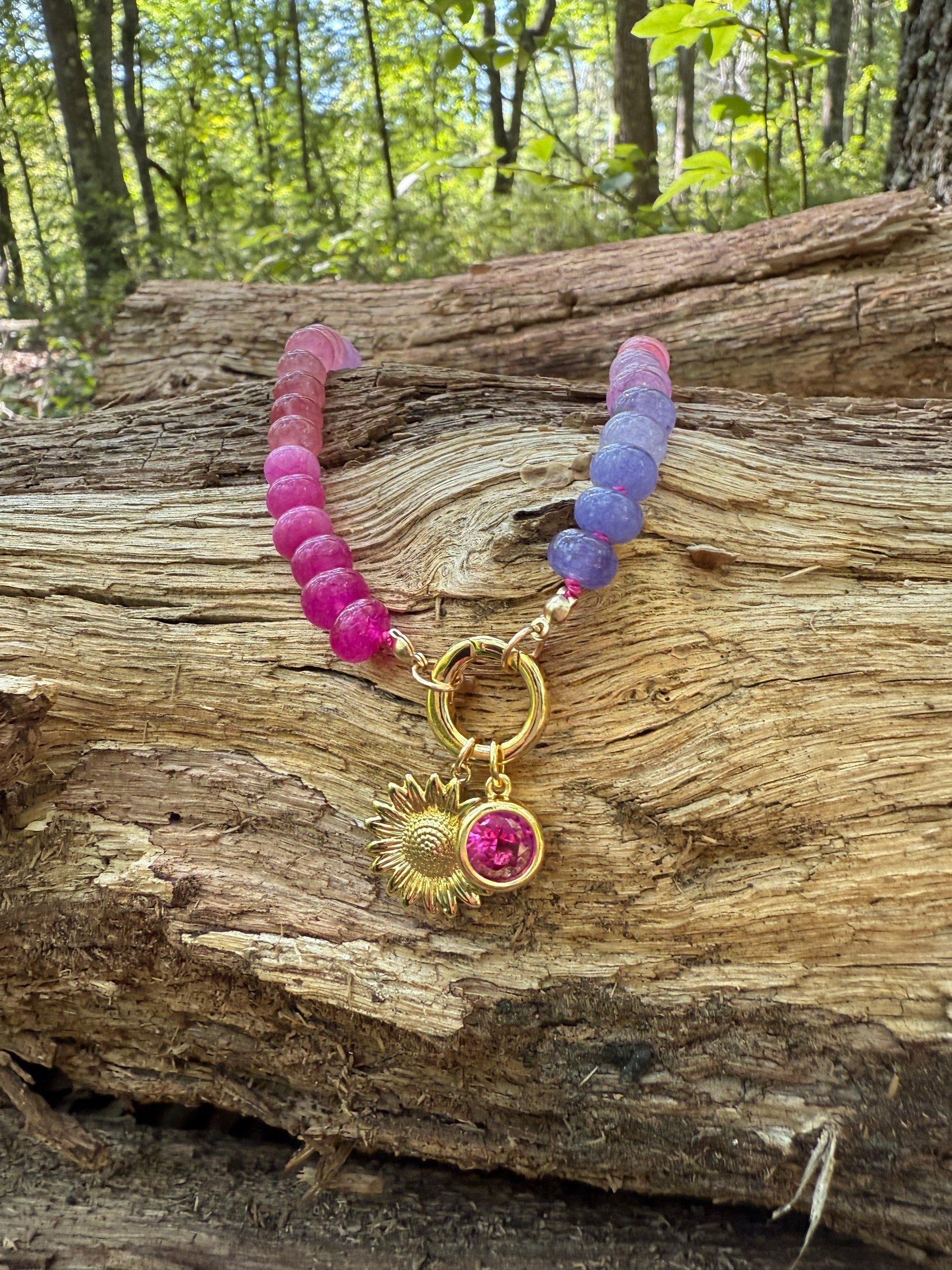 The Berry Ombre Necklace features hand-knotted silk that’s custom-dyed that compliments the juicy pink and purple ombre of 8mm quartz beads, paired with gold-filled findings. Each necklace is uniquely made and offers plenty of options to personalize with different clasps and charms.