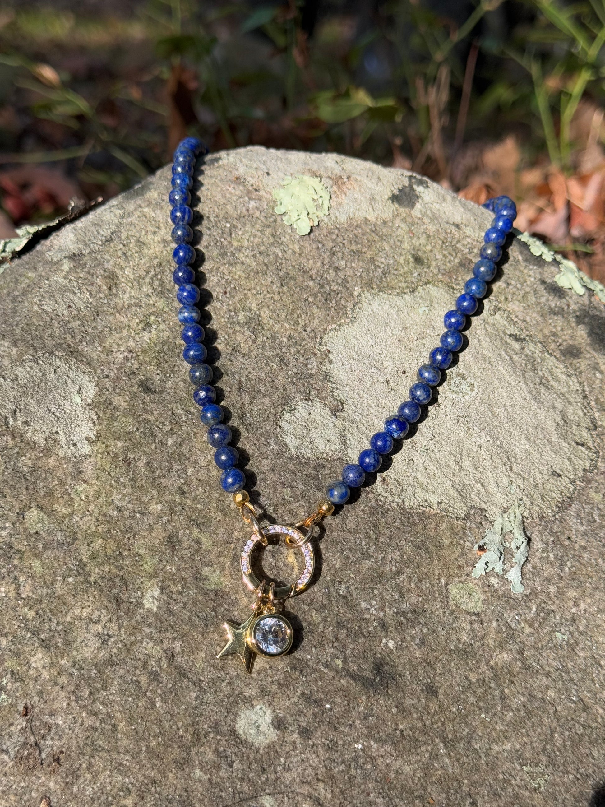 The Blue Sky Necklace is just over 16" long. It features vibrant 6mm blue Lapis beads threaded on a gold-toned wire, finished with gold-filled findings, all connected by a cz studded 18mm Caribiner clasp. It playfully includes a gold-filled star charm alongside a sparkling gold-filled CZ birthstone charm.
