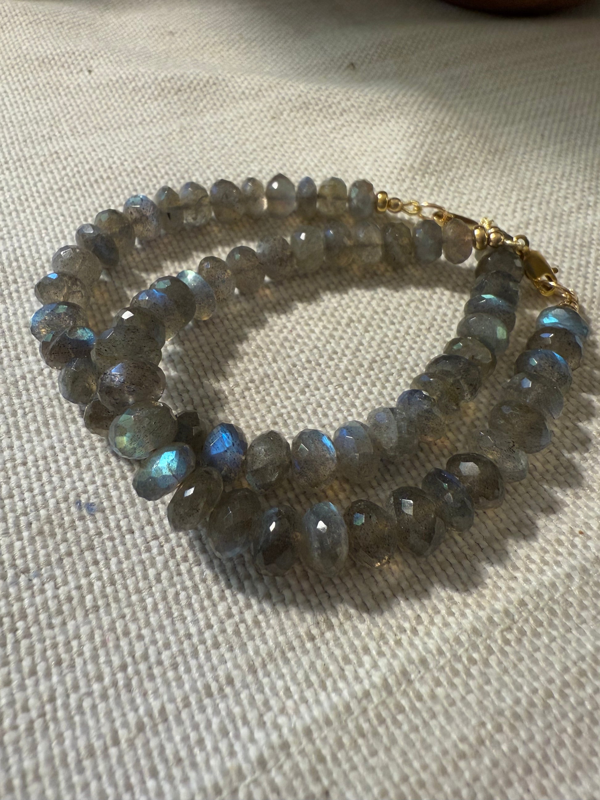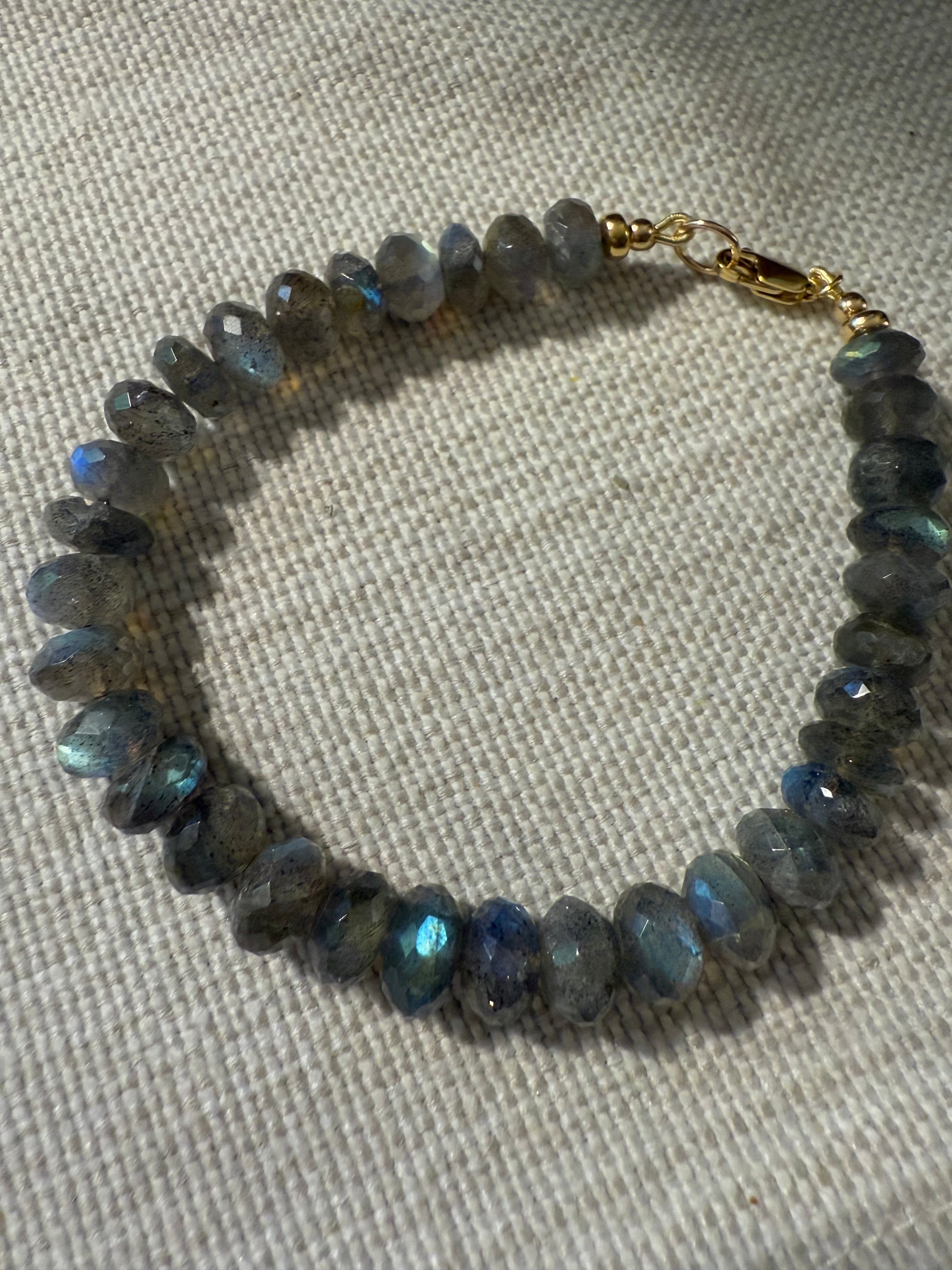 Stunning faceted 8mm labradorite beads make this chunky bracelet truly shine. Sized at 6.5" and strung on gold-tinted wire with gold-filled accents and French wire fastenings, it’s a dazzling piece that photos just can’t capture. These beads light up beautifully in the sunlight!