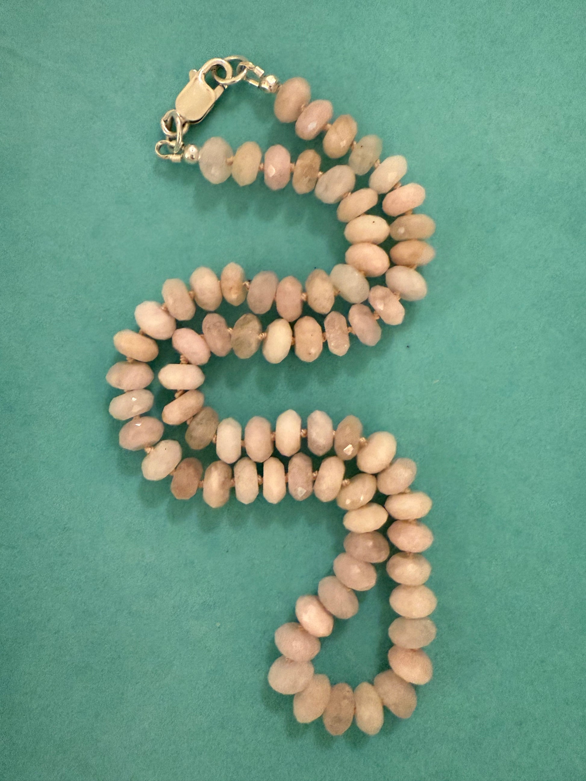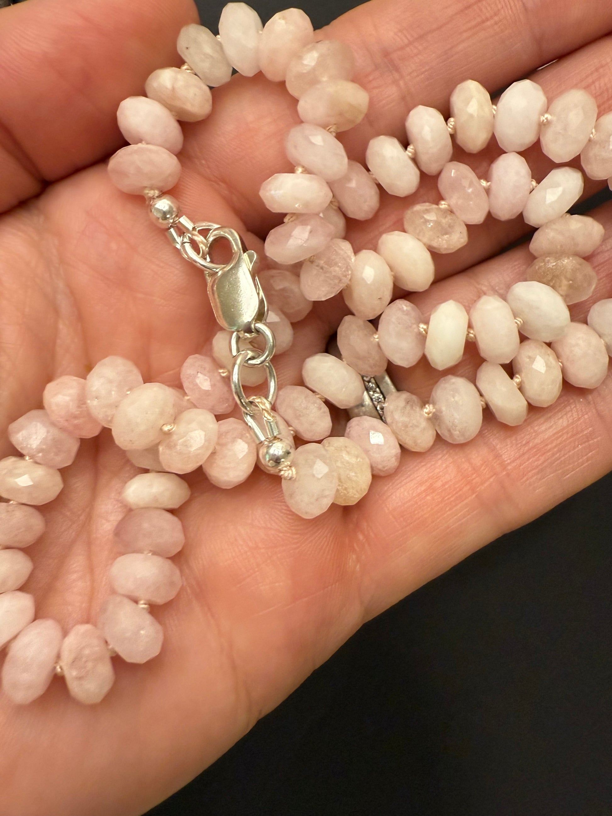 The Cotton Candy Morganite necklace features exquisite 8-9mm faceted Morganite rondelle beads that display a blend of translucent to opaque hues in delicate pink tones. Measuring 18" long, this elegant piece is hand knotted on matching blush pink silk and finished with a 15mm Sterling Silver lobster clasp and coordinating findings.