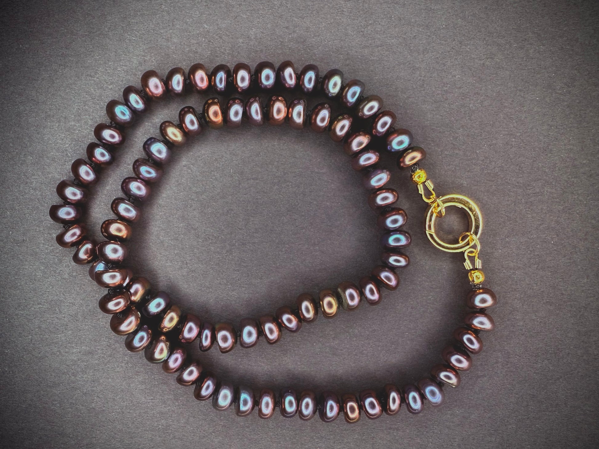 The Oil Slick pearl necklace presents lustrous dark freshwater button pearls, each measuring 8mm, featuring iridescent oil slick tones that shimmer beautifully in varying light. At 20" in length, this refined necklace is hand-knotted on black silk and secured with a 15mm gold-filled circle clasp and matching findings. The clasp can be worn at the front to highlight custom charms or turned to the back for a more classic look.