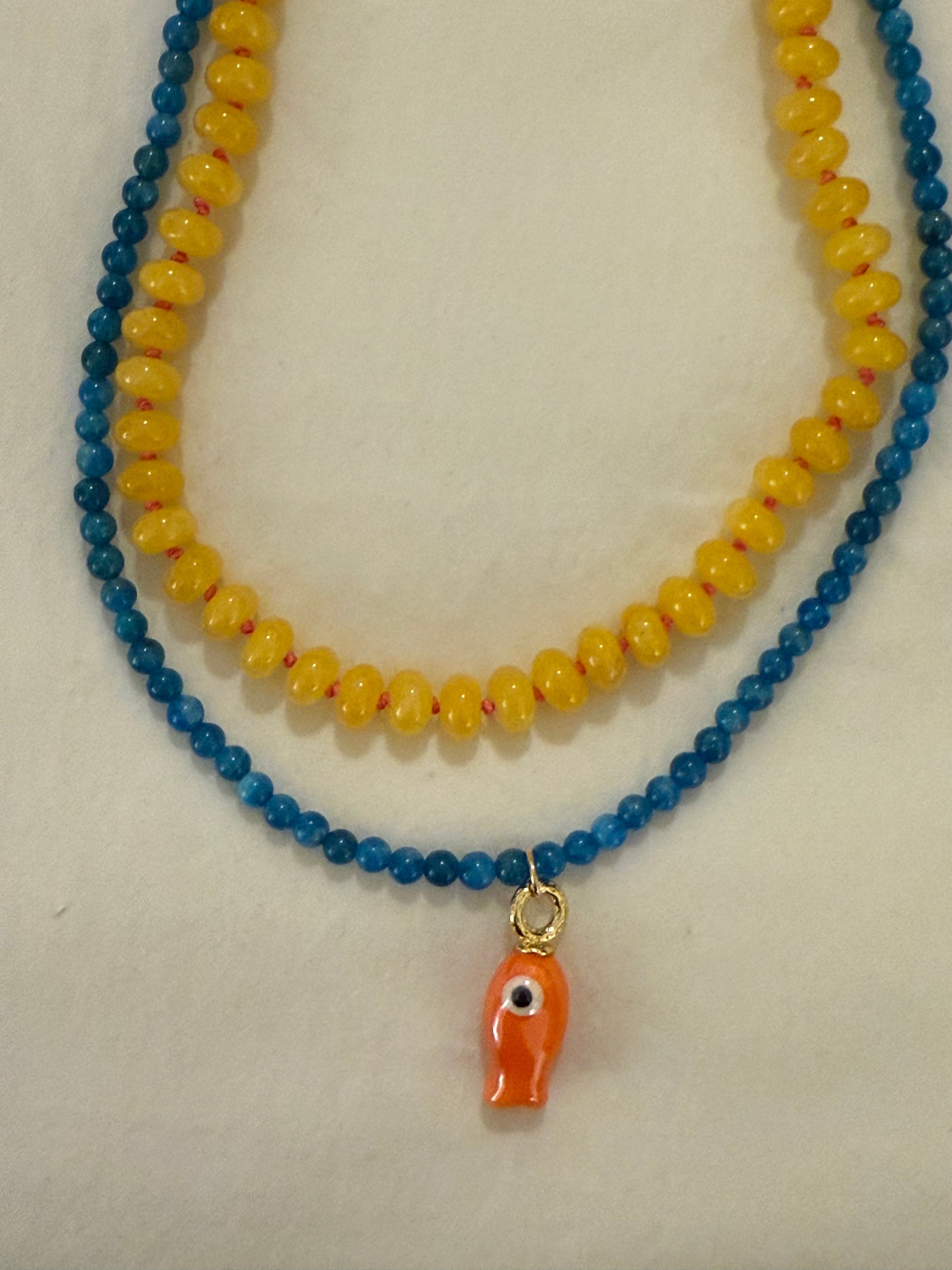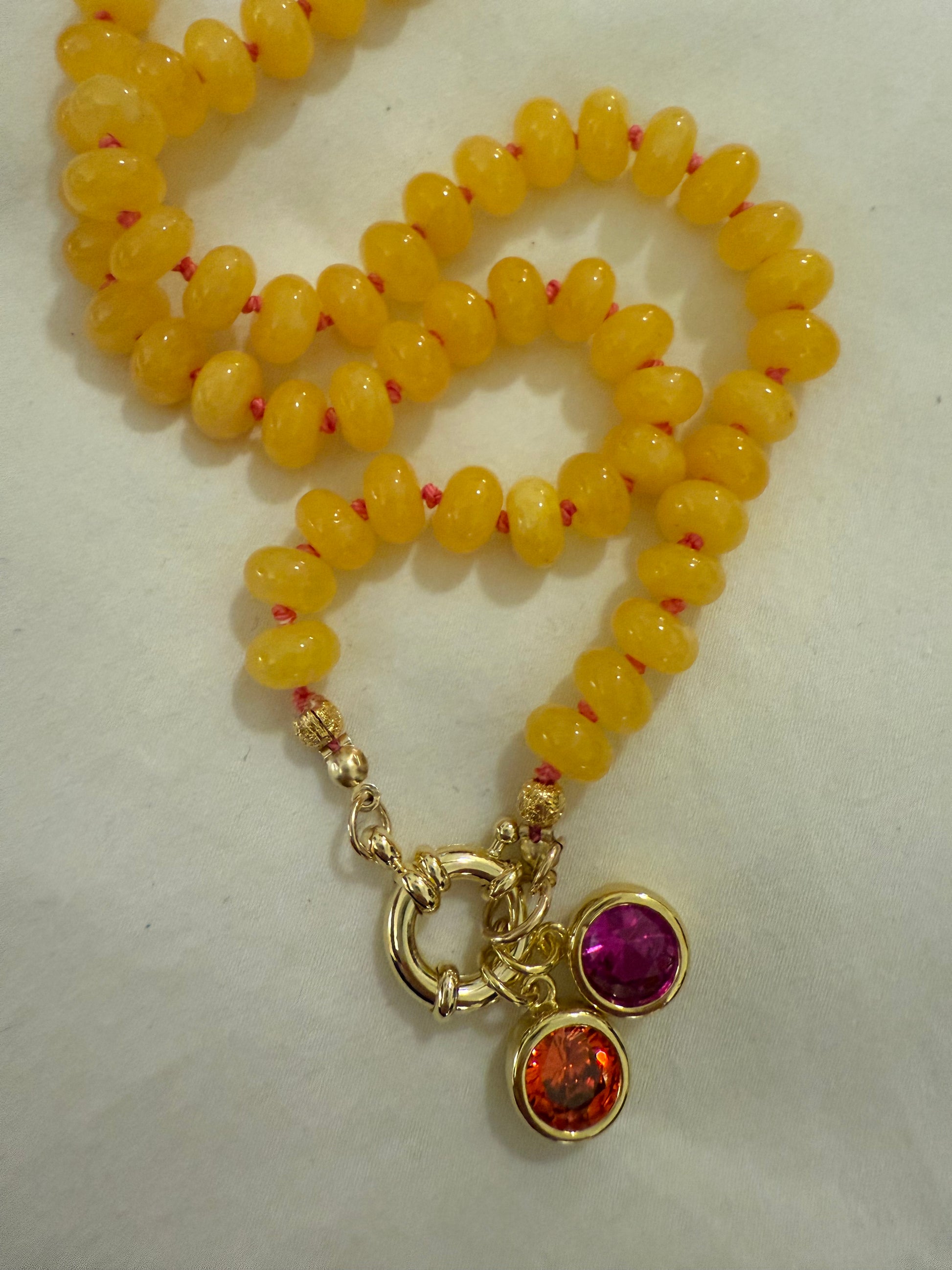 The Lemon Drop Necklace features hand-knotted silk that’s custom-dyed in bright neon pink that compliments the sunny yellow 8mm quartz beads, paired with gold-filled findings. Each necklace is uniquely made and offers plenty of options to personalize with different clasps and charms.
