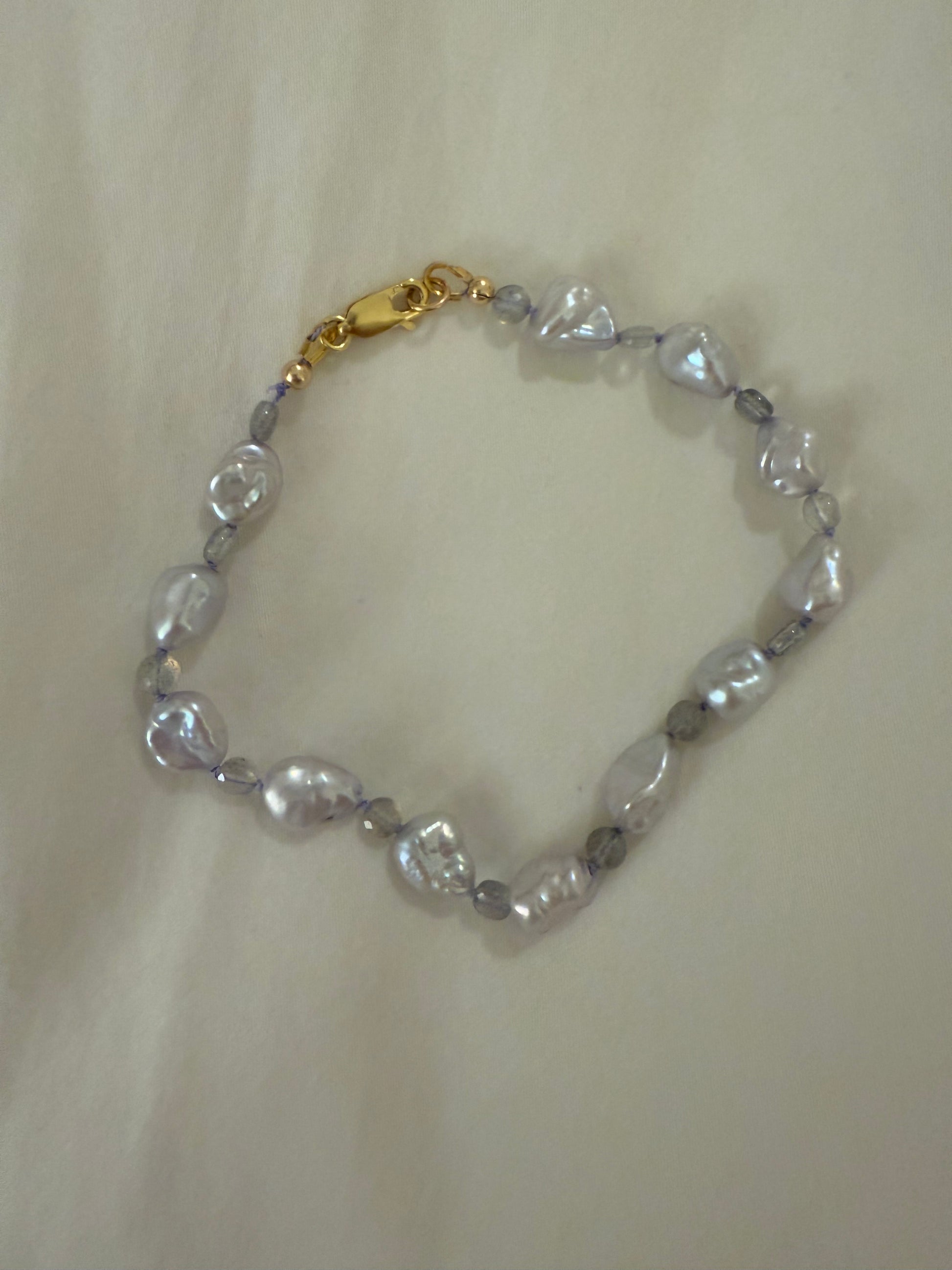 The Sweet Dreams Bracelet is just as gorgeous as the matching necklace. It showcases unique 8-10mm freshwater Keshi pearls alternating with 4mm Labradorite stones that softly shimmer with an enchanting violet hue. Measuring 6.5" in length, each pearl and gemstone is carefully hand-knotted on delicate pale lavender silk. The necklace is completed with an 18mm gold-filled spring clasp and fittings.