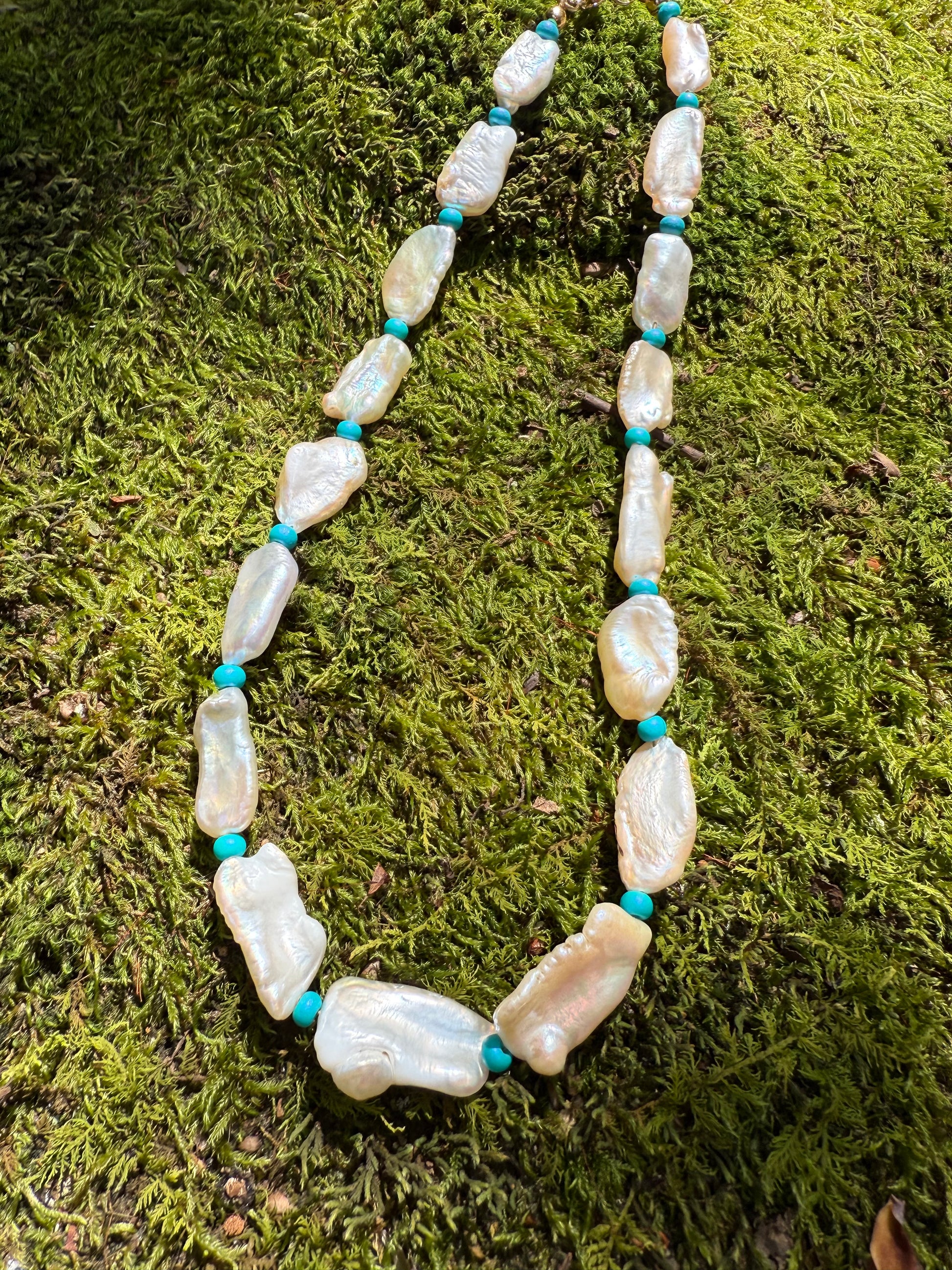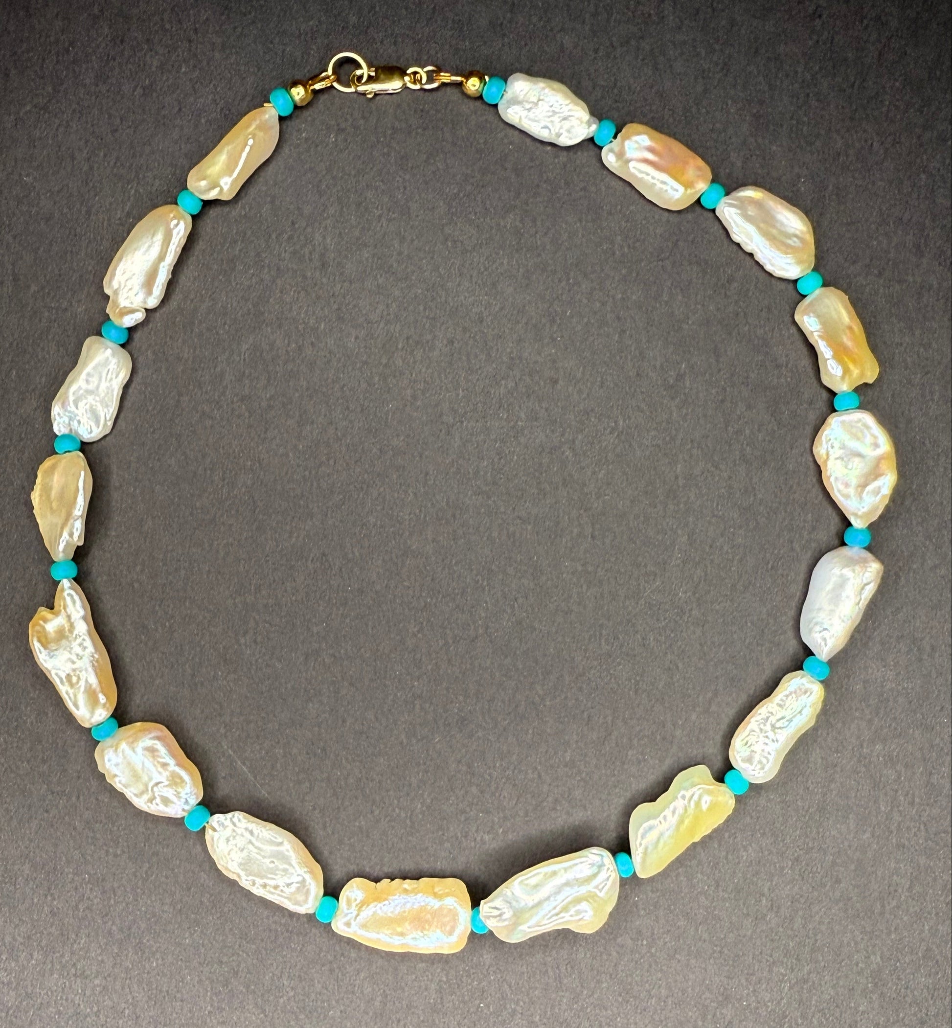 The Chunky Pearl Necklace features distinctive chunky rectangular 15-22mm natural freshwater pearls in a soft peach hue, interspersed with luminous teal glass beads that catch the light beautifully. Crafted on a gold-toned beading wire and finished with a 7mm gold-filled spring clasp, this necklace offers an elegant yet bold summer statement. This necklace is 16" in length.