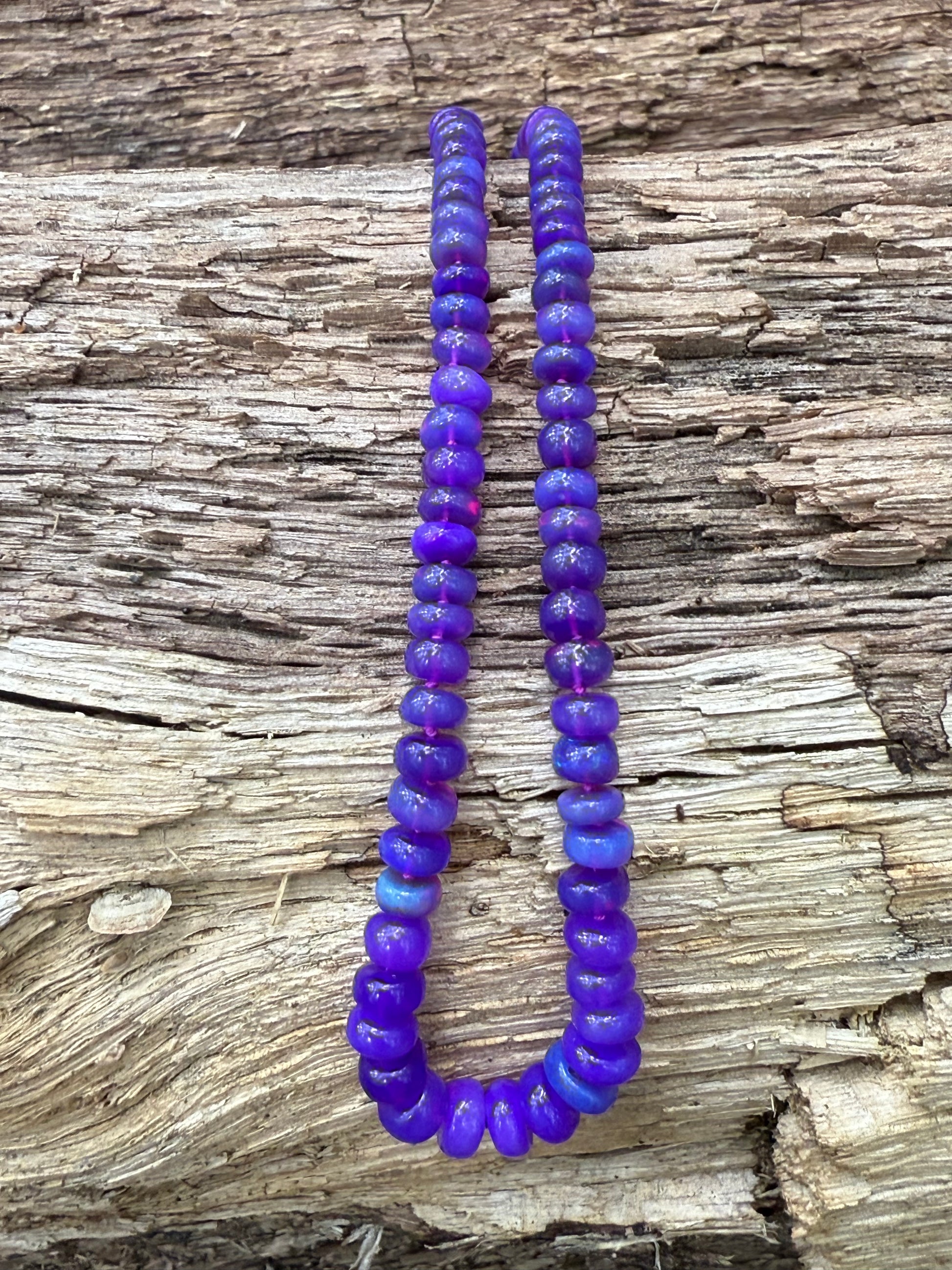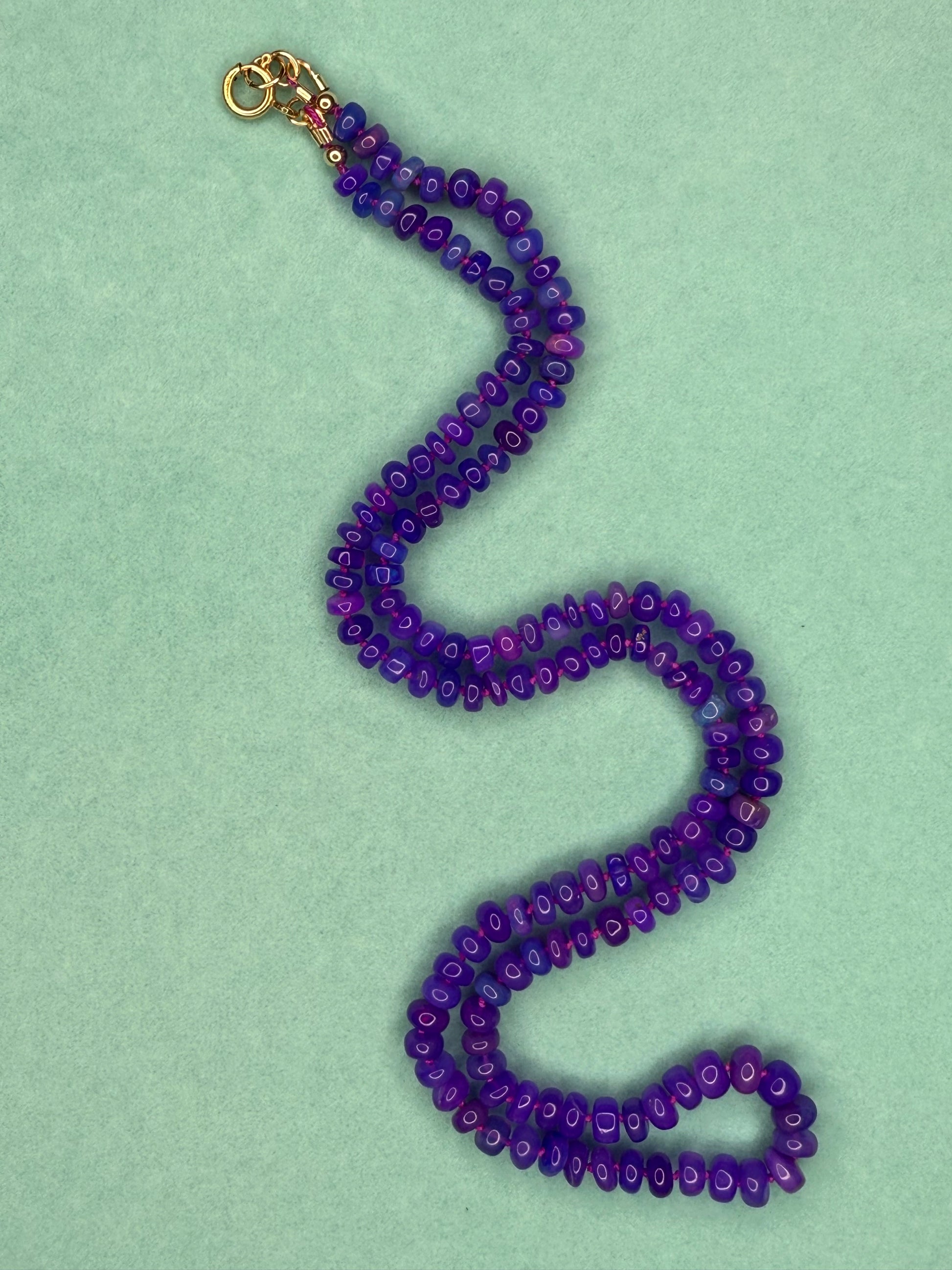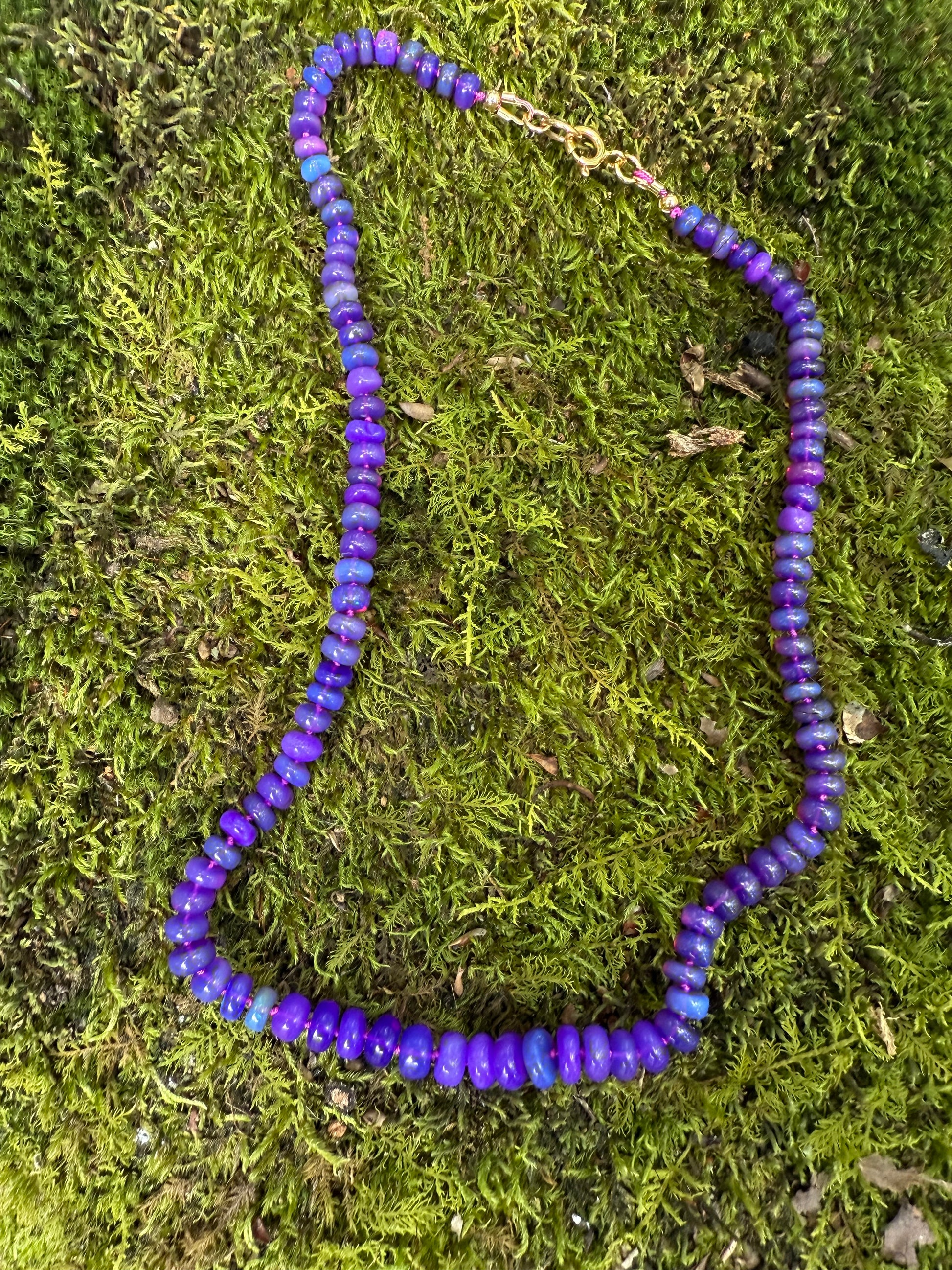 The Violet Opal Necklace features hand-knotted custom-dyed silk paired with gorgeous bright purple violet Ethiopian Opals and accented by gold-filled findings. Each necklace is one of a kind and can be further personalized with a variety of gold-filled clasps and charms. The opal beads are graduated from 4-6mm.