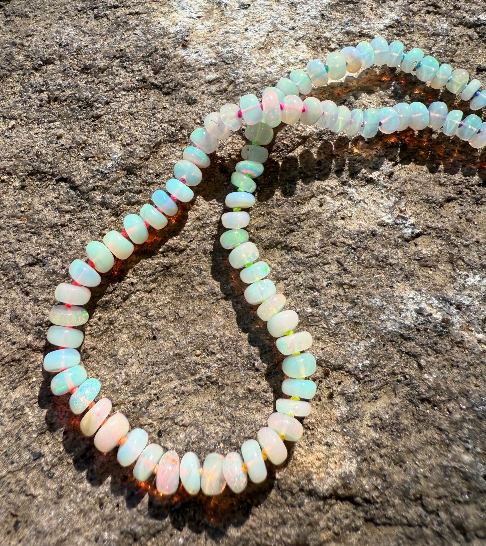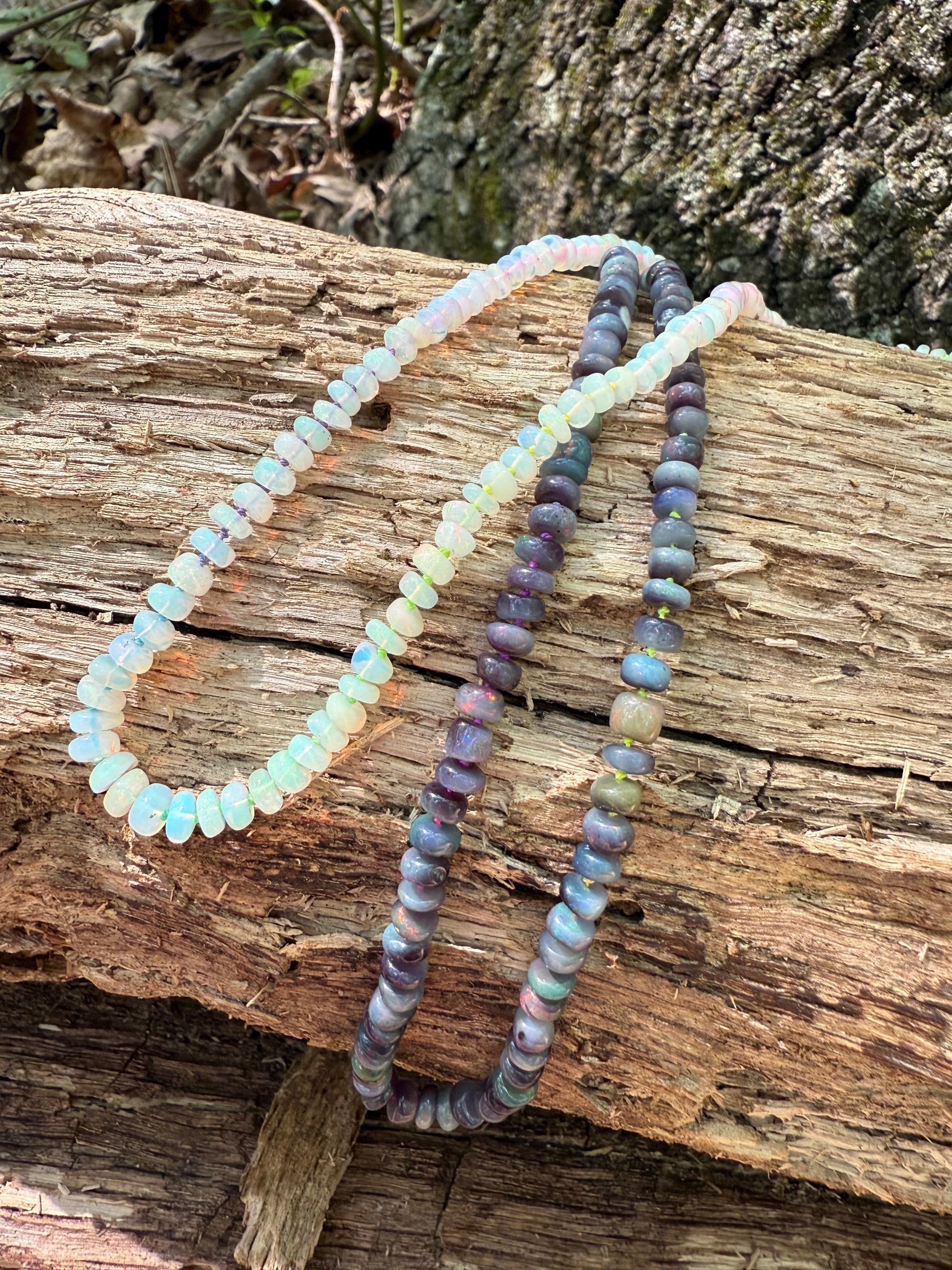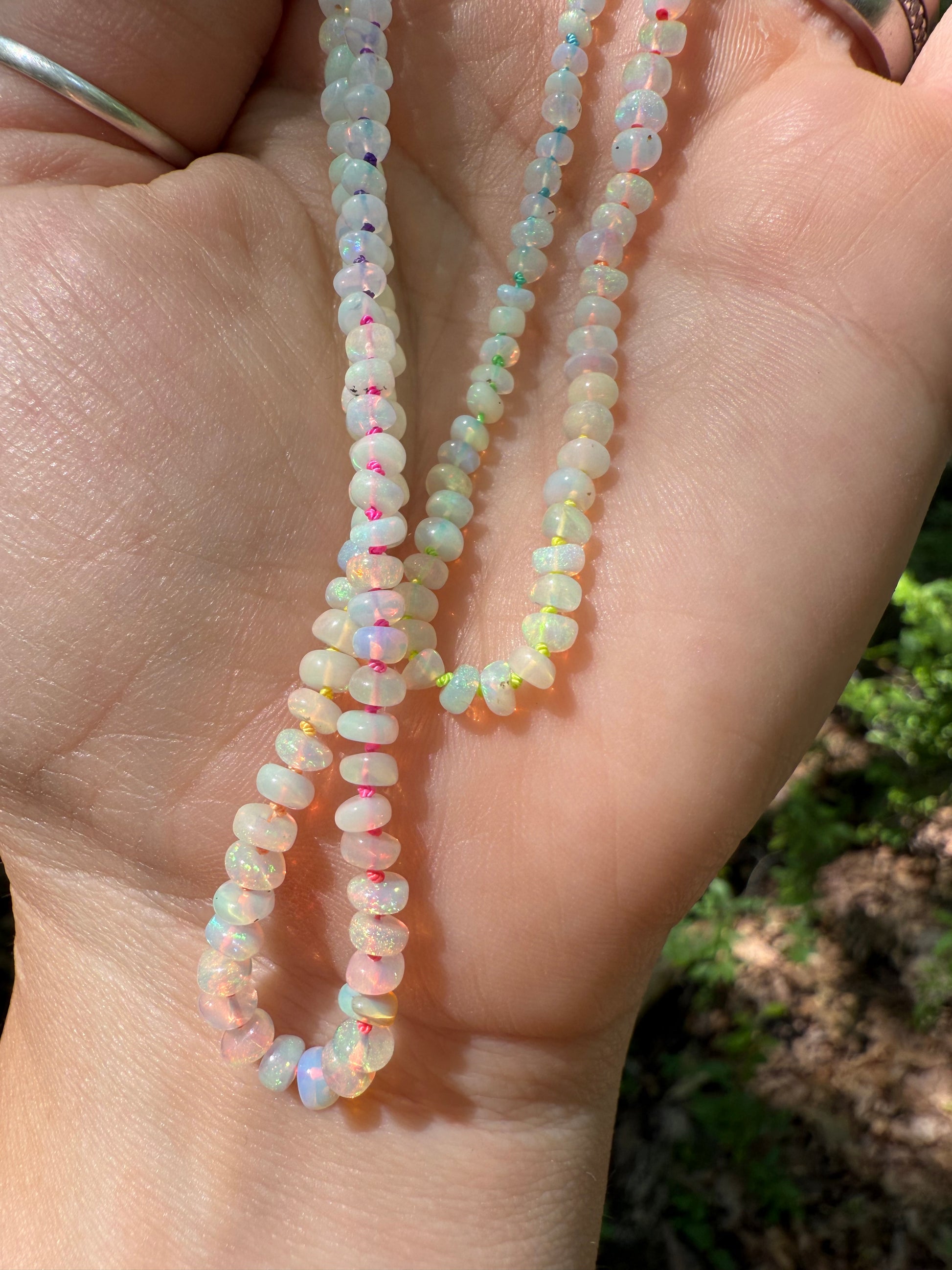 The Opal Rainbow Cord Necklace features hand-knotted custom-dyed rainbow silk paired with gorgeous shimmering white Ethiopian Opals and accented by gold-filled findings. Each necklace is one of a kind and can be further personalized with a variety of gold-filled clasps and charms. The opal beads are graduated from 3-5mm. Currently available in 17" and 22" lengths.